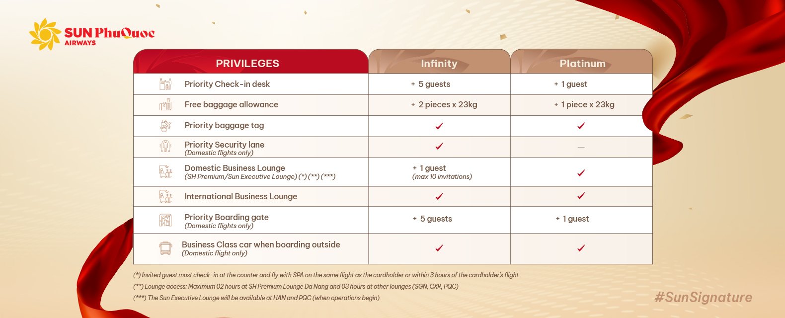 Sun PhuQuoc Airways understands that your distinguished status is proof of your dedication and achievements. To ensure your prestige continue uninterrupted, we are proud to introduce the Sun Signature program - “Prestige Intact, Privileges Aligned”
