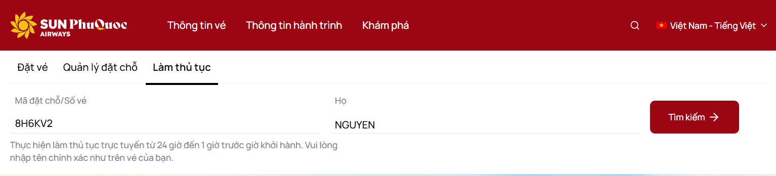 Nhập Mã đặt chỗ và Họ của một trong số những hành khách tham gia chuyến bay.